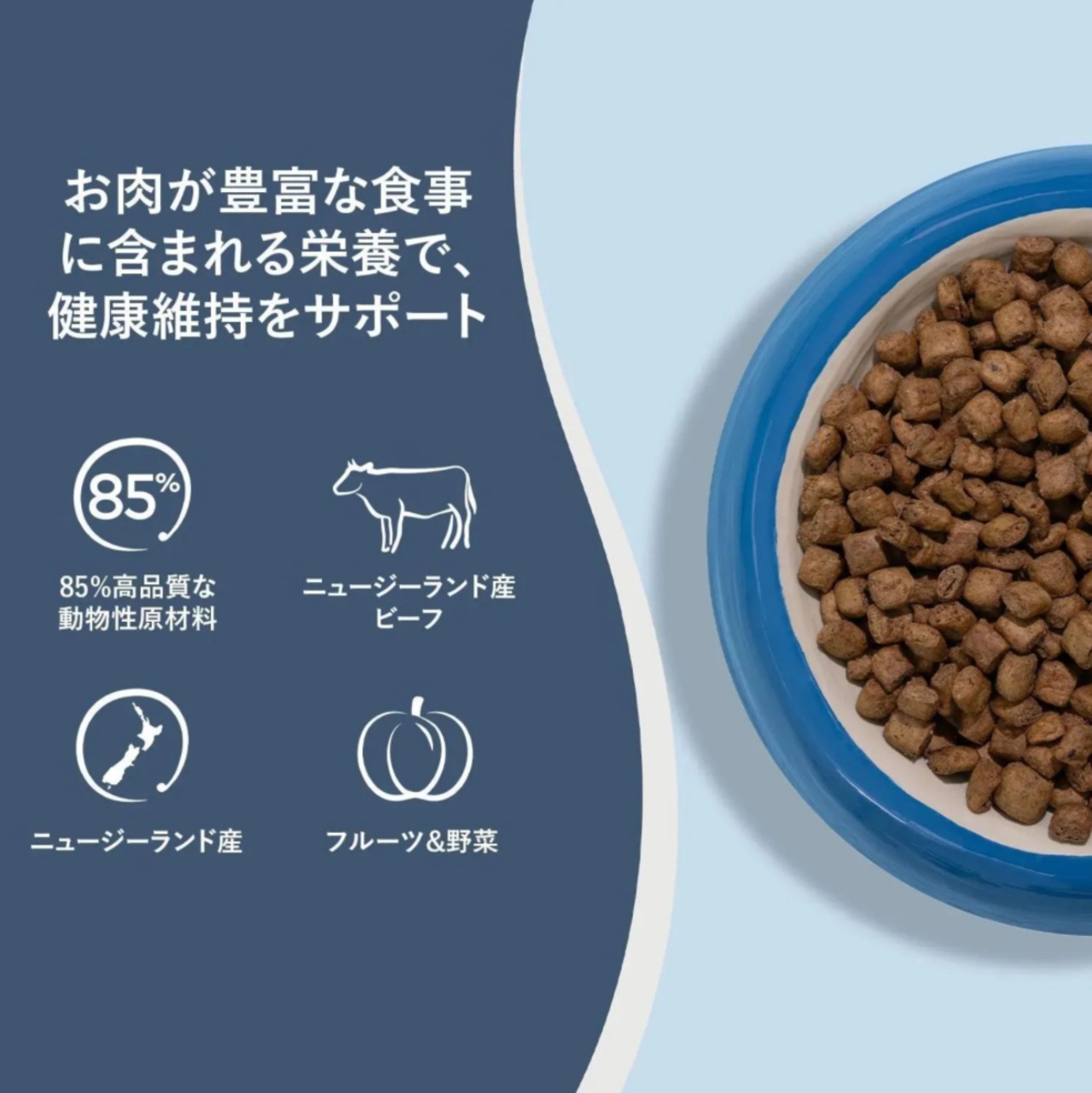 ・ニュージーランドの緑豊かな牧草地で倫理的な方法で調達されたラム生肉と、消化器官の健康維持をサポートするホウレン草、ケール、サヤインゲンとチコリルートのブレンドを使用して作られています。