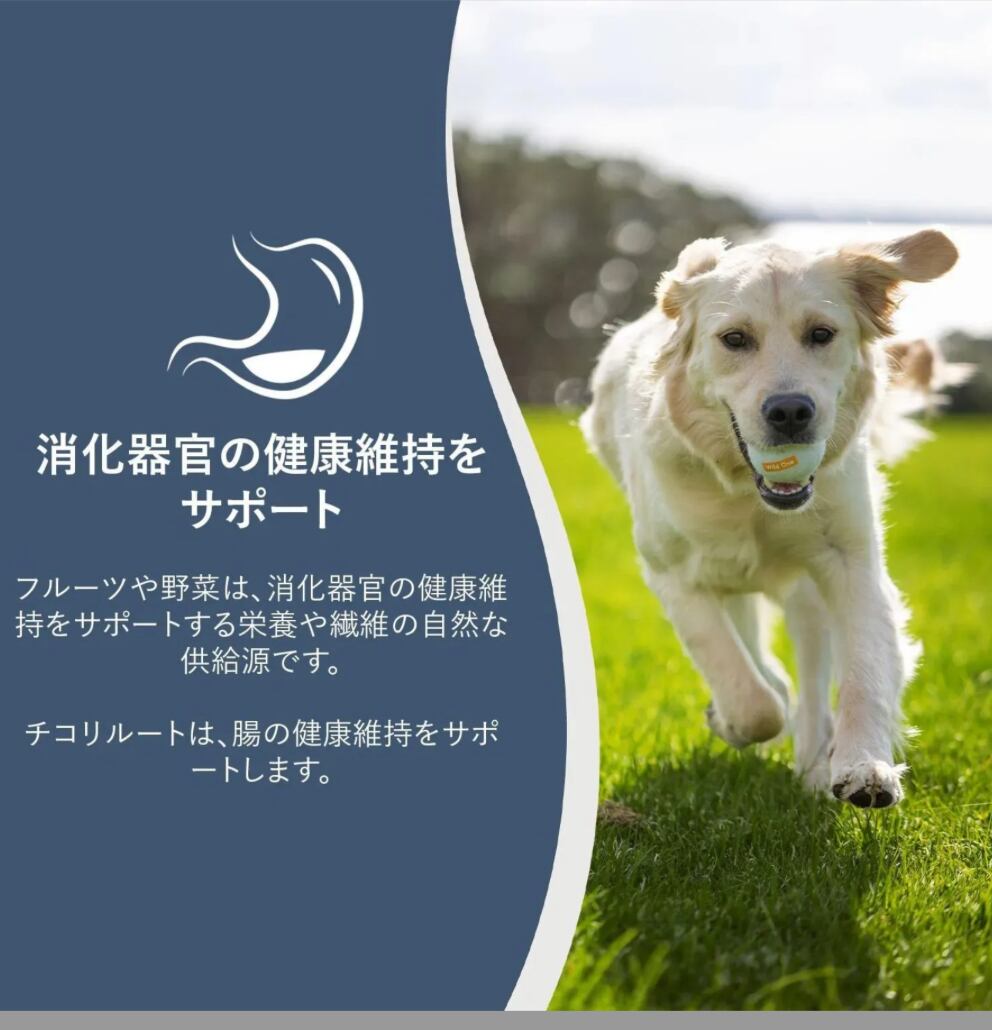 ・ニュージーランドの緑豊かな牧草地で倫理的な方法で調達されたチキン生肉と、消化器官の健康維持をサポートするオーチャードフルーツとチコリルートを使用して作られています。
