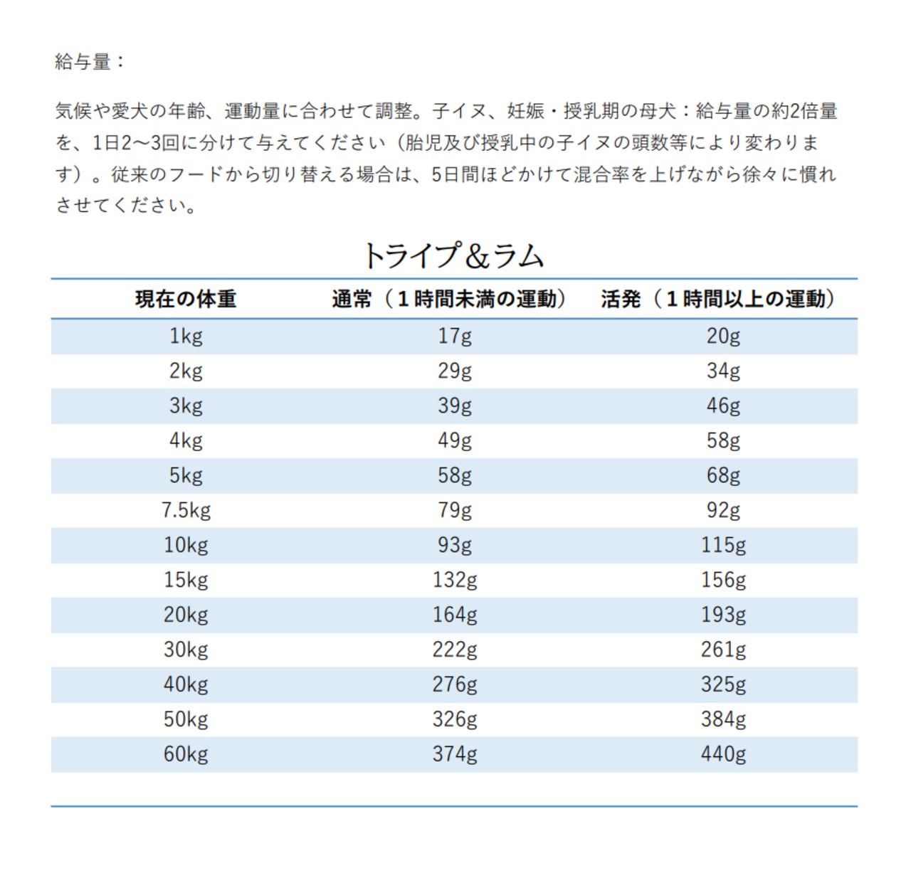 ※1日の食事量は左記の表を目安に、気候や愛犬の年齢、運動量に合わせて調整してください。子犬、妊娠・授乳期の母犬:給与量の約2倍量を、1日2~3回に分けて与えてください(胎児及び授乳中の子犬の頭数等により変わります)。従来のフードから切り替える場合は、5日間ほどかけて混合率を上げながら徐々に慣れさせてください。愛犬の健康のために常に清潔で新鮮な飲み水をご用意ください。